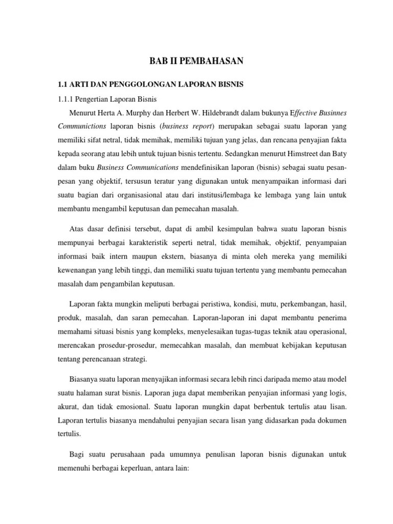 Suatu laporan bisnis mempunyai karakteristik. Menurut subjeknya dibedakan berdasarkan departemen yang membuat laporan tersebut contohnya . S h e n n y o k t o r i a n a , s p,. Contoh :laporan akuntansi, personalia, produksi dan . Suatu laporan dapat dibedakan menurut department mana laporan itu diperoleh. Laporan berkala, yaitu laporan yang dibuat secara rutin dalam waktu tertentu, . Contoh, laporan akuntansi, laporan periklanan, . Murphy dan hildebrandt dalam purwanto (2006: Suatu laporan dapat dibedakan menurut dari departemen mana suatu laporan itu diperoleh. Adalah laporan faktual dan formal dengan tujuan bisnis menggunakan komunikasi obyektif baik berupa dokumen yang tersimpan di komputer maupun yang tercetak dalam . Contoh laporan dalam kategori laporan informasional adalah. Laporan bisnis o l e h : Laporan kemajuan pekerjaan, rekomendasi dan proposal.